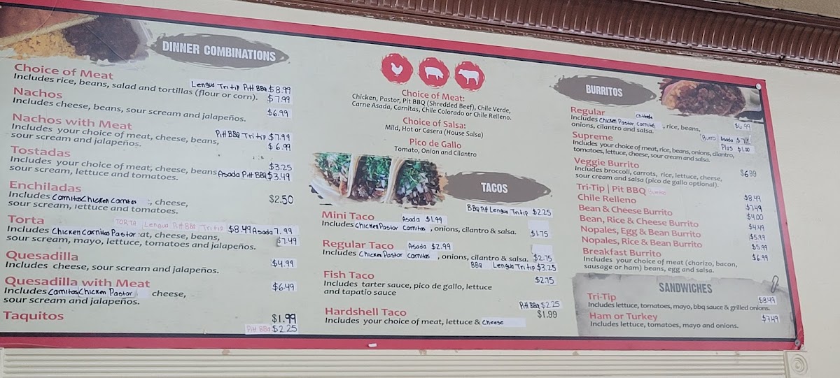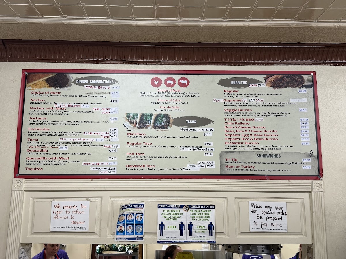 The Burritos selection is extensive, including Regular, Supreme, Veggie, TriTip Pit BBQ, Chile Relleno, Bean & Cheese, Bean, Rice & Cheese, Nopales with Egg & Bean, Nopales with Rice & Bean, and Breakfast Burritos. This range supports both meat and vegetarian preferences and caters to meals suitable for breakfast or casual dining.